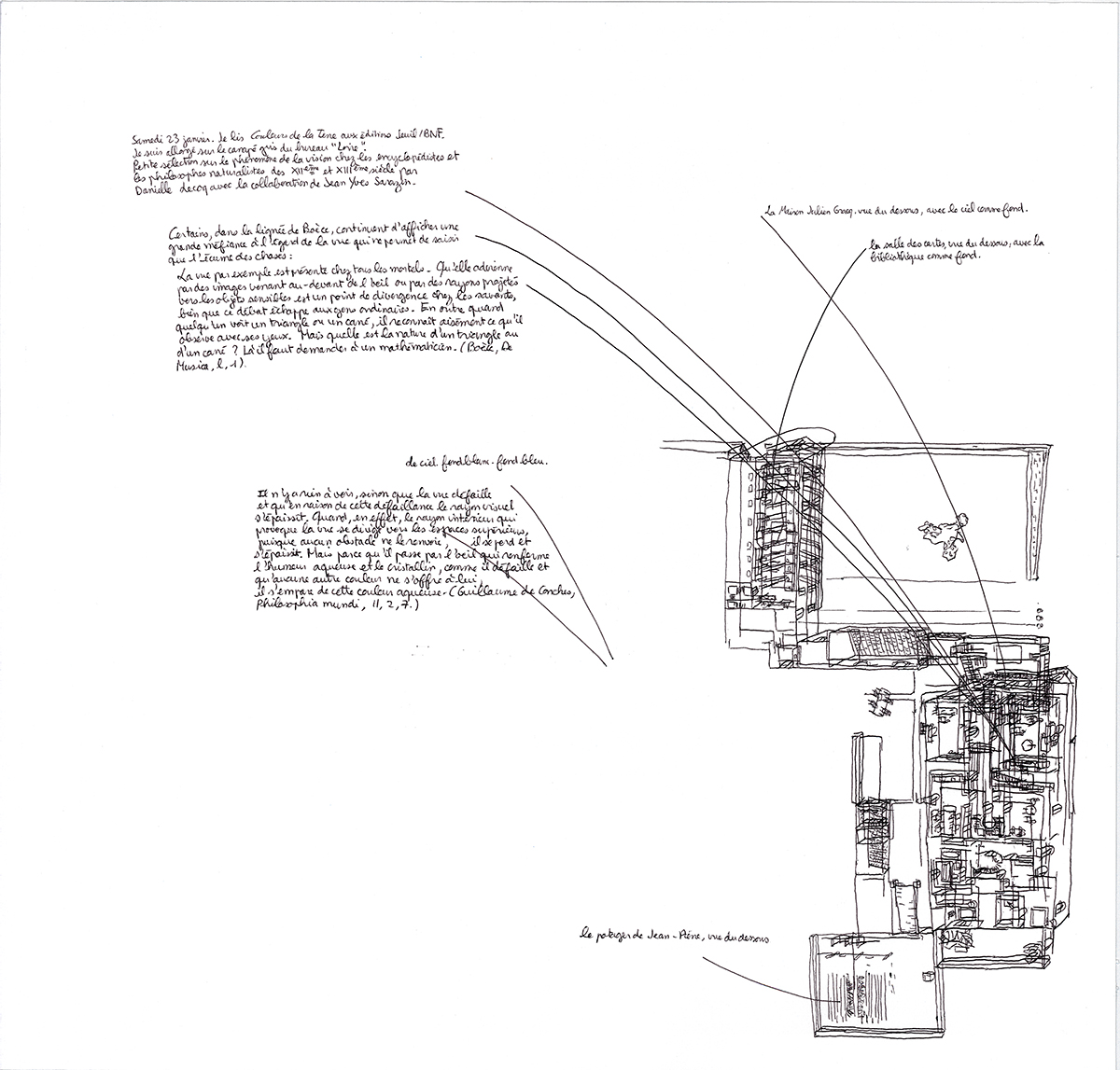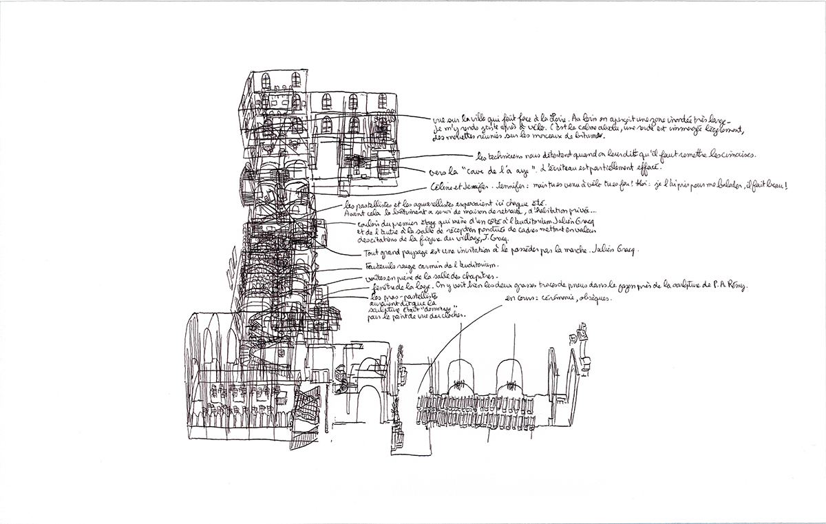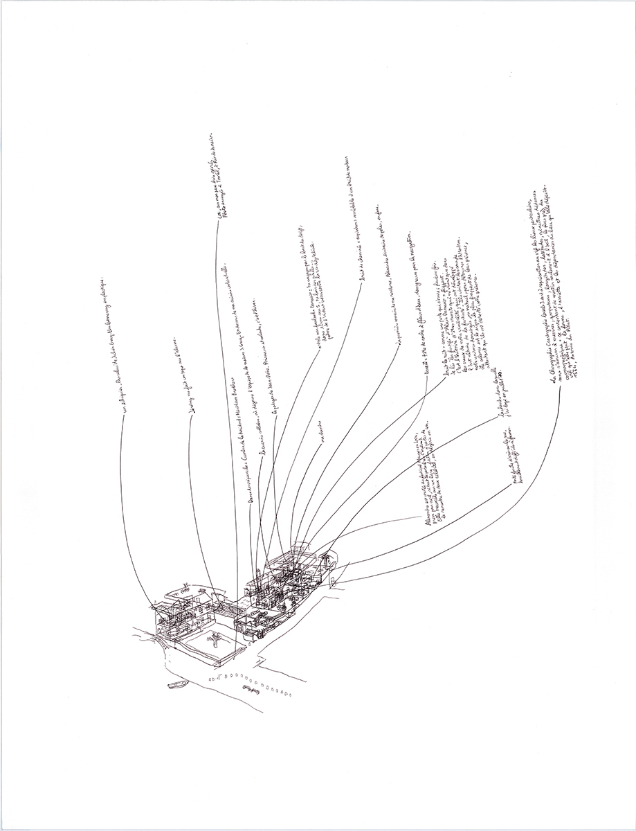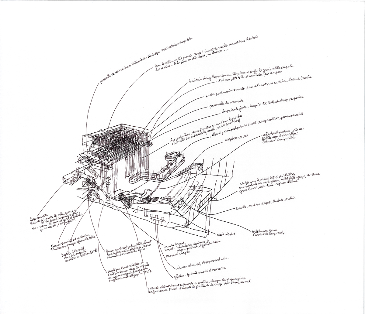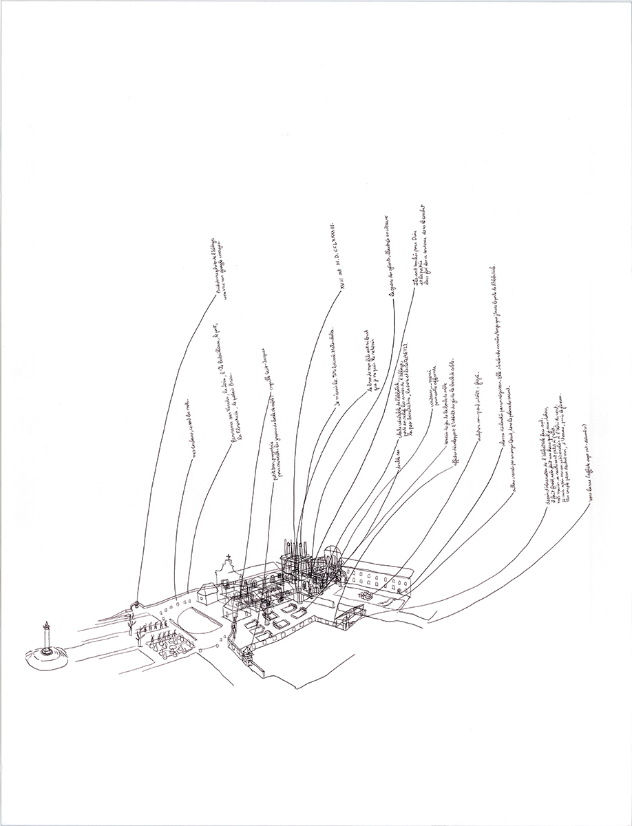 « Chaque fois qu’il visite un bâtiment ou une exposition, le jeune artiste retrace de mémoire les expériences spatiales qu’il vient de vivre. Ses dessins rappellent des passages, des mouvements, des escaliers, des murs et des limites à travers des projections axonométriques résumant une expérience subjective. Les détails qui attirent son attention sont traduits en de fins tracés au stylo et sont parfois enrichis par de courts textes décrivant des situations spécifiques ou ajoutant d’autres couches de perception.»