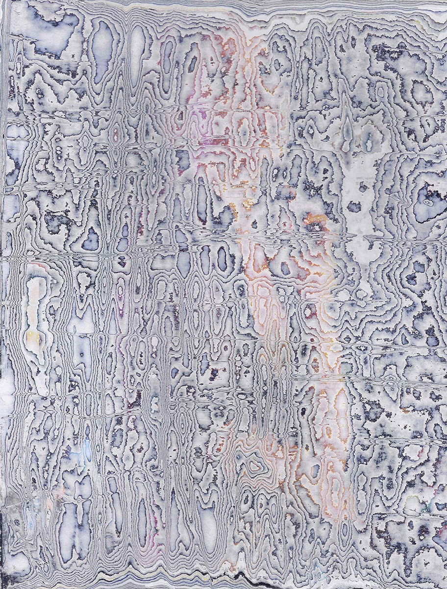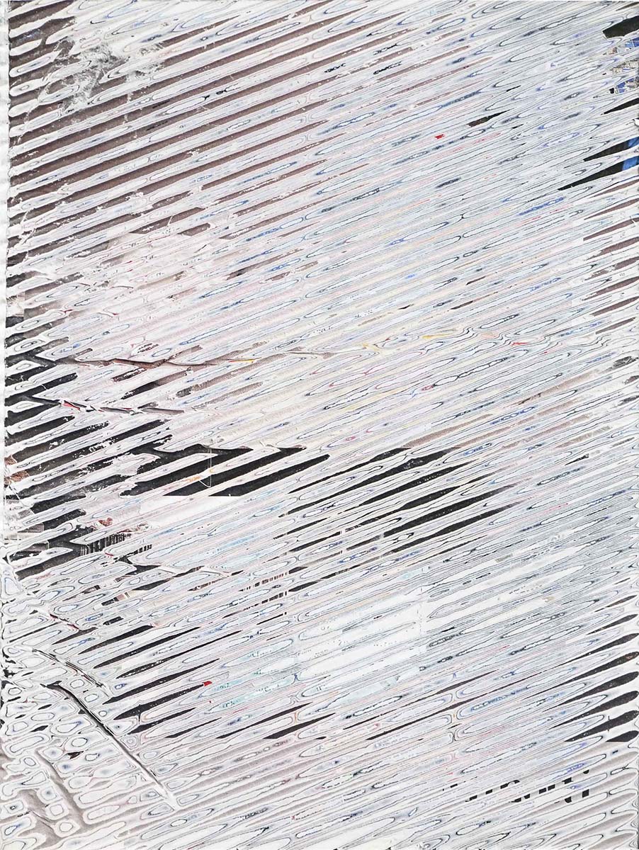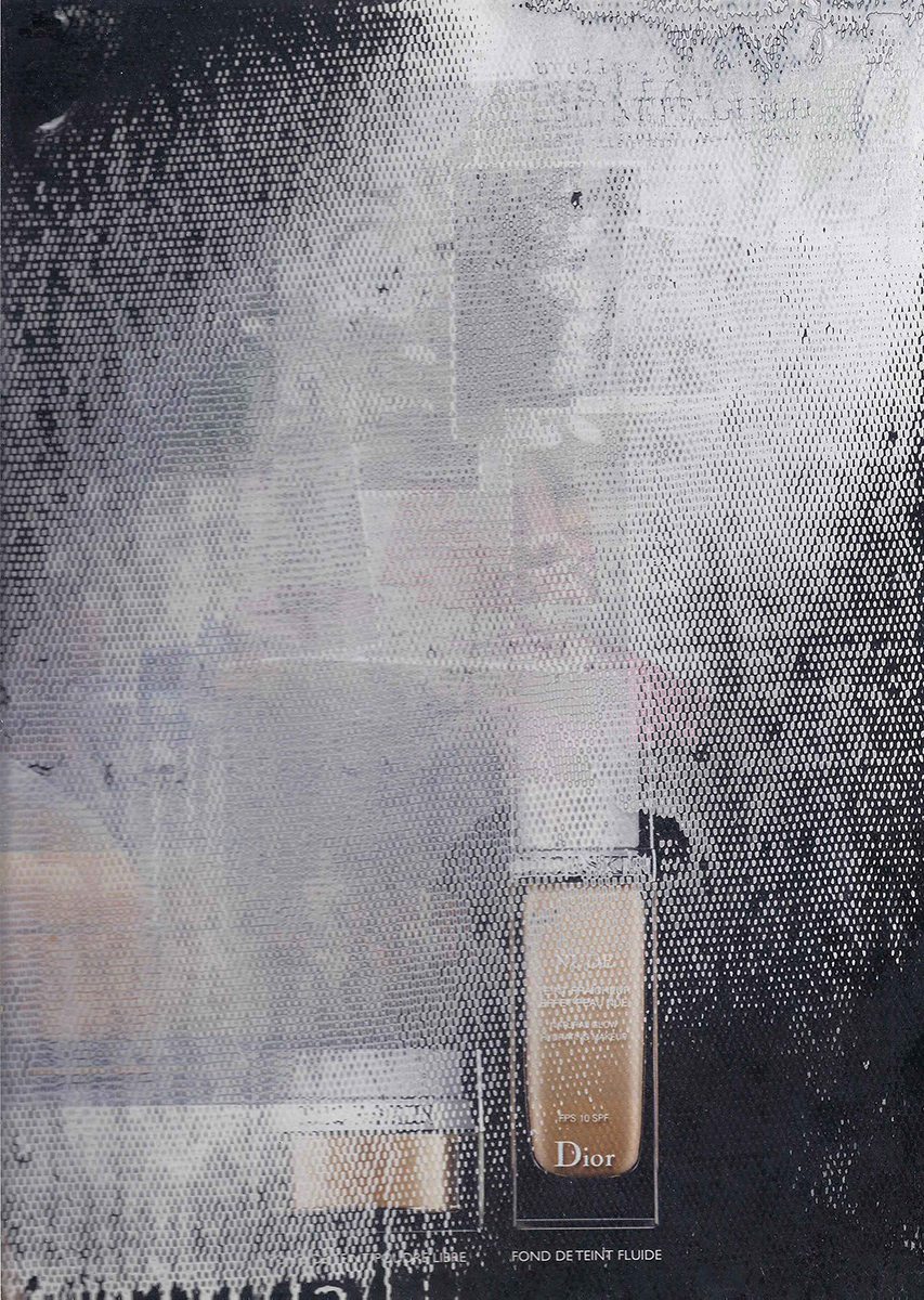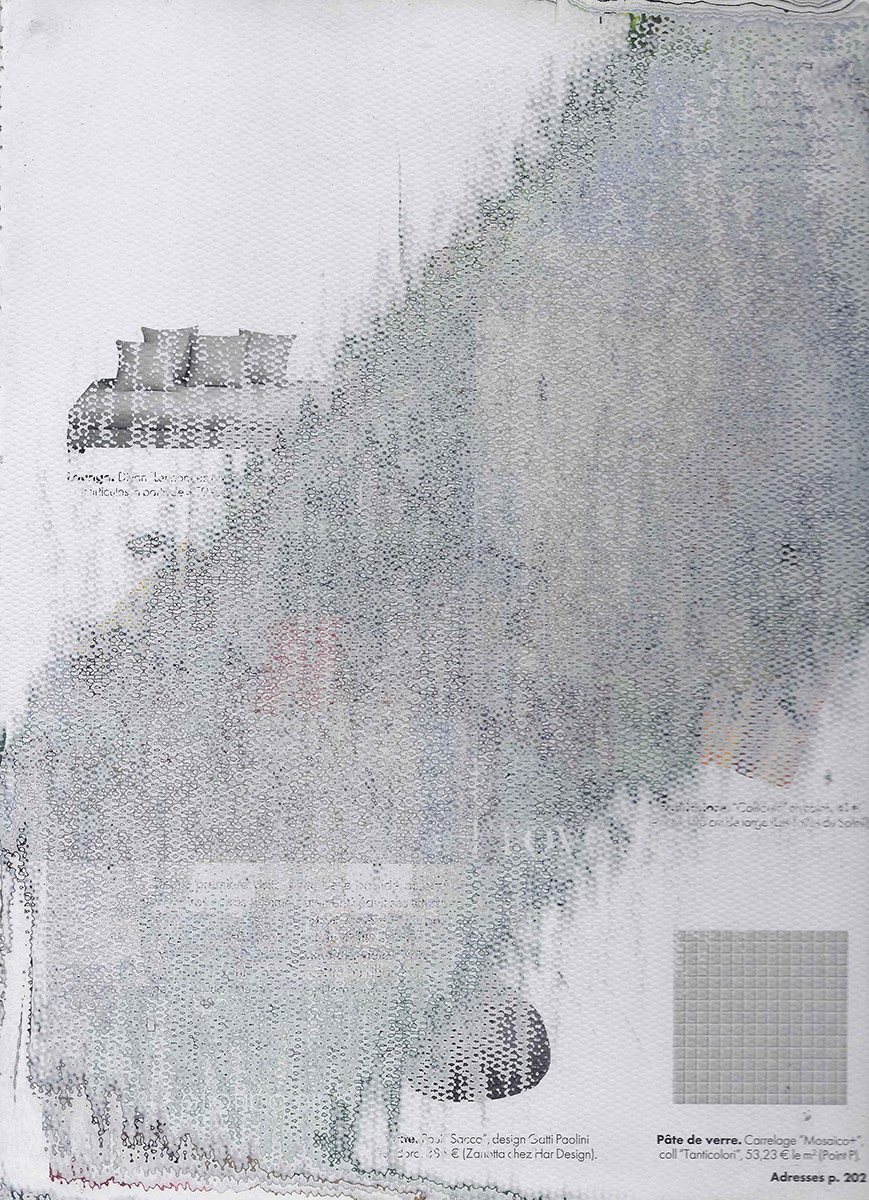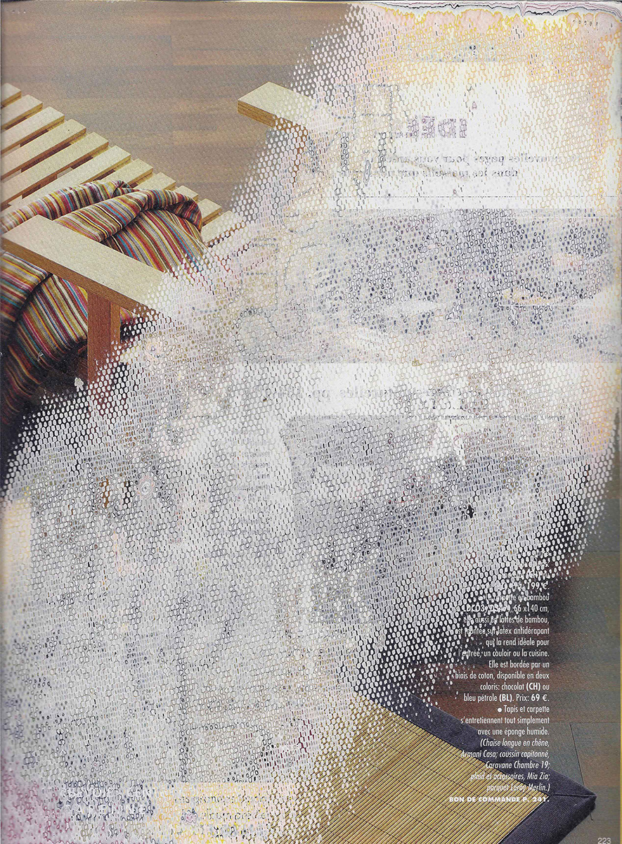 J’ai développé une technique de compression de papier, créant des supports aux usages multiples dont la surface une fois poncée revêt des motifs plus ou moins aléatoires. Le magazine papier est présenté comme un artefact de lui-même, un solide non consultable qui communique avec le regardeur de façon transversale, à travers les couches superposées formant sa surface.