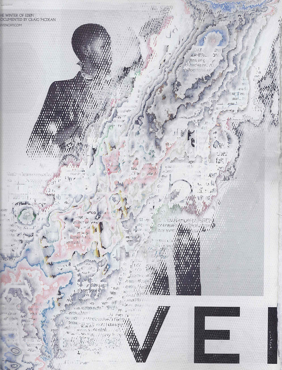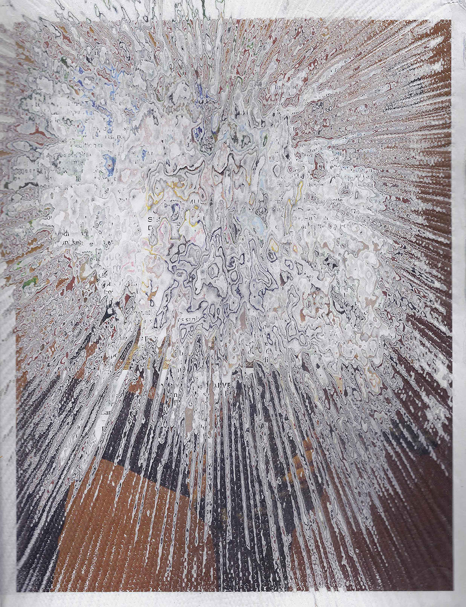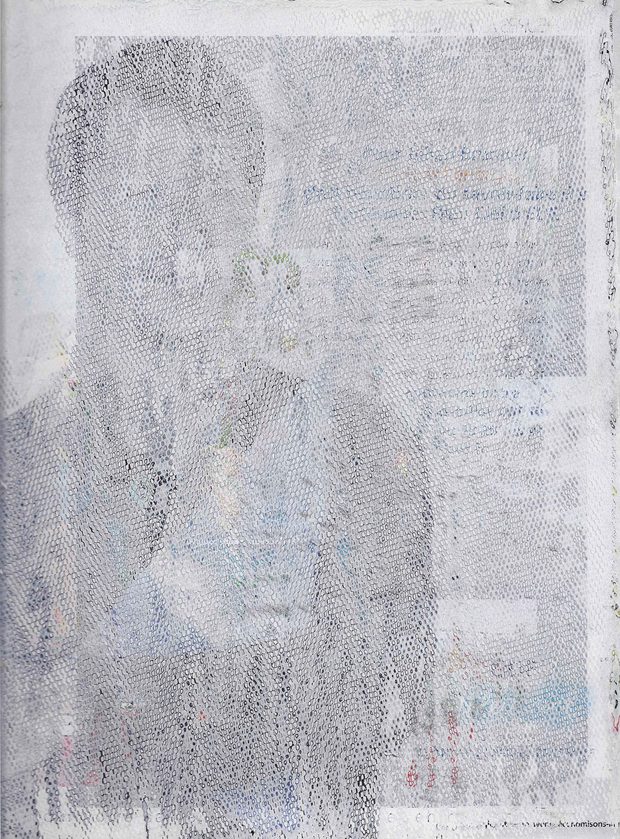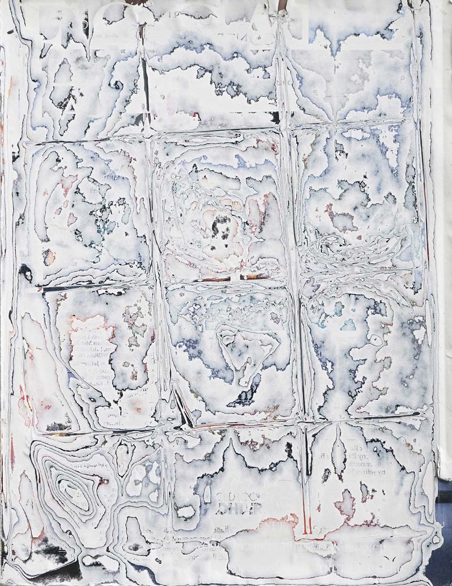 J’ai développé une technique de compression de papier, créant des supports aux usages multiples dont la surface une fois poncée revêt des motifs plus ou moins aléatoires. Le magazine papier est présenté comme un artefact de lui-même, un solide non consultable qui communique avec le regardeur de façon transversale, à travers les couches superposées formant sa surface.