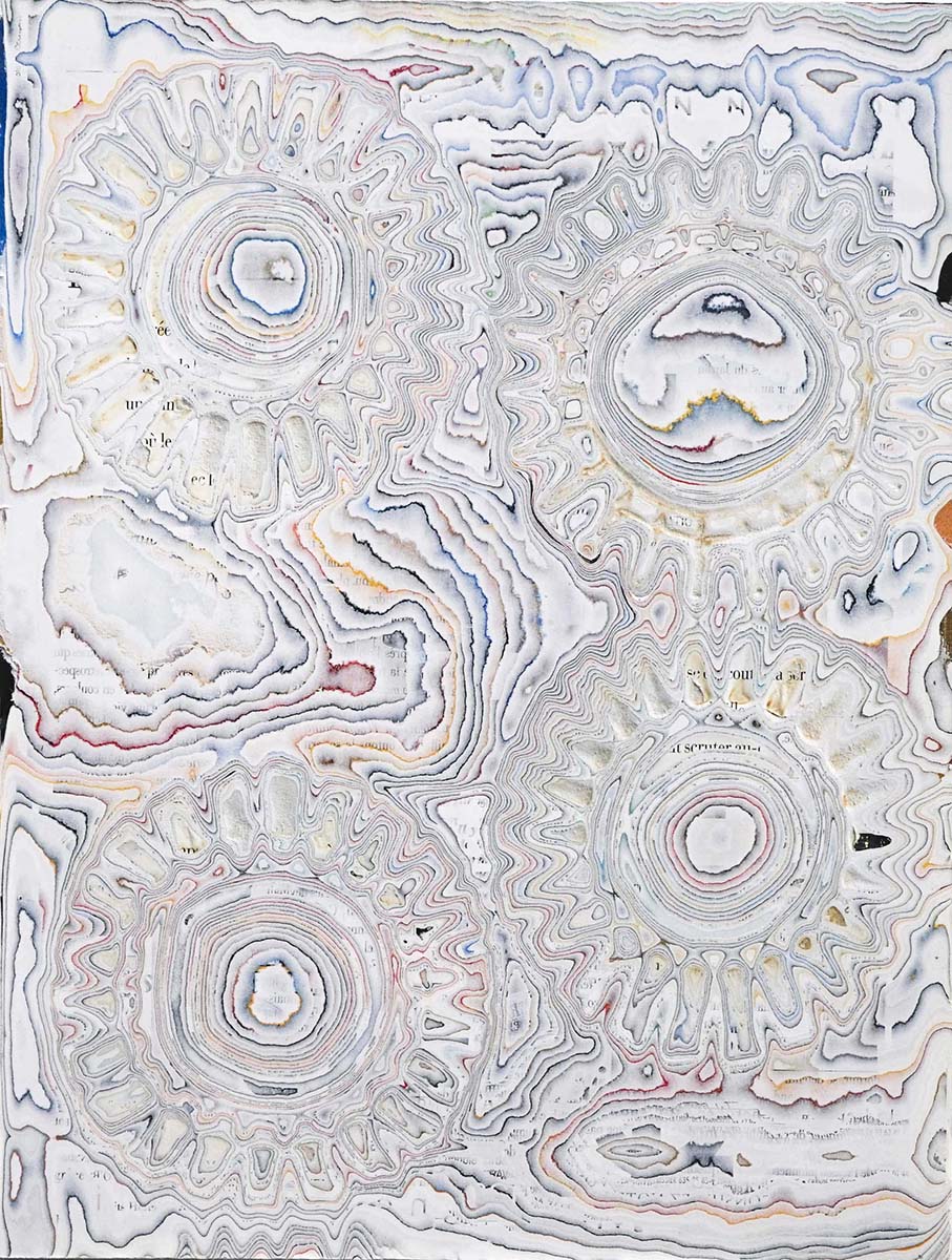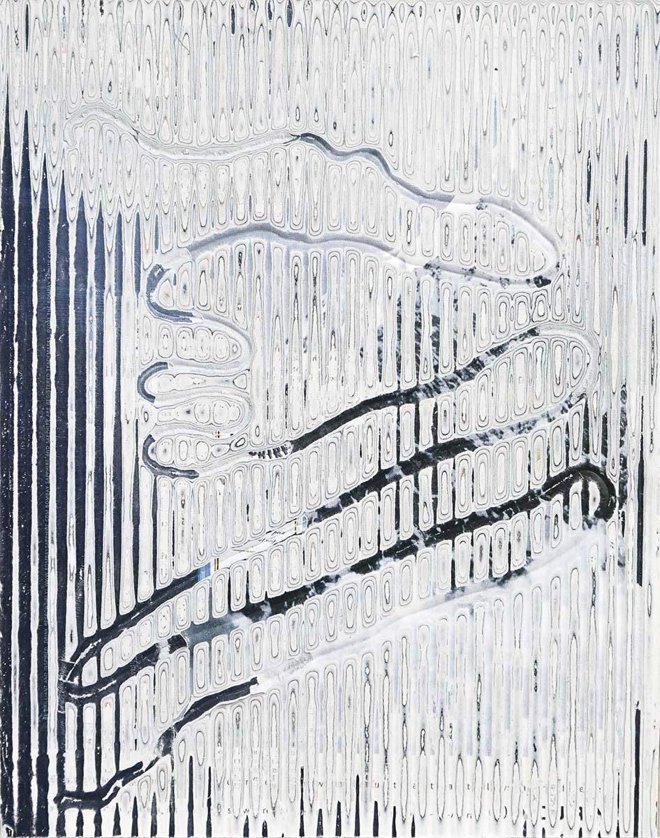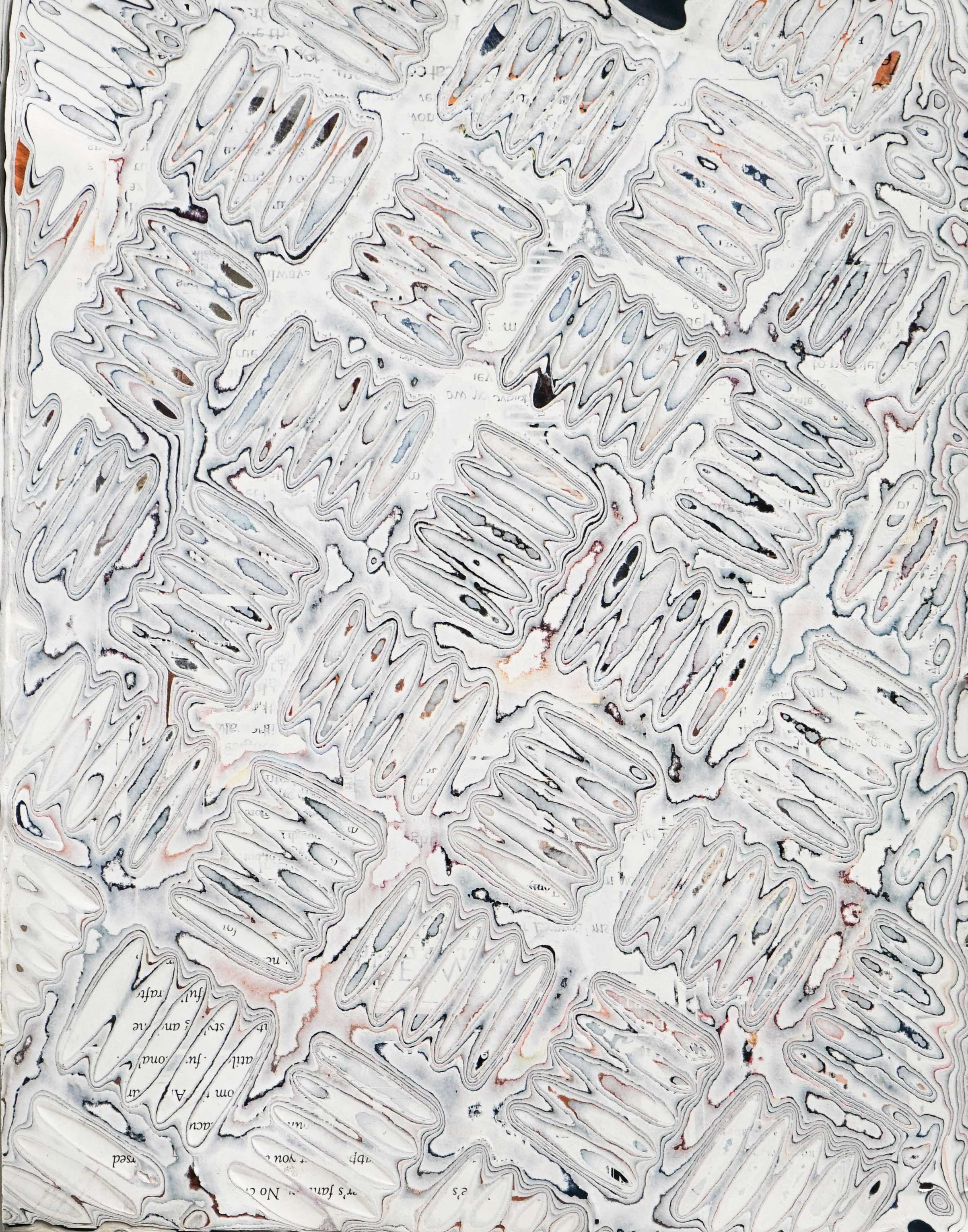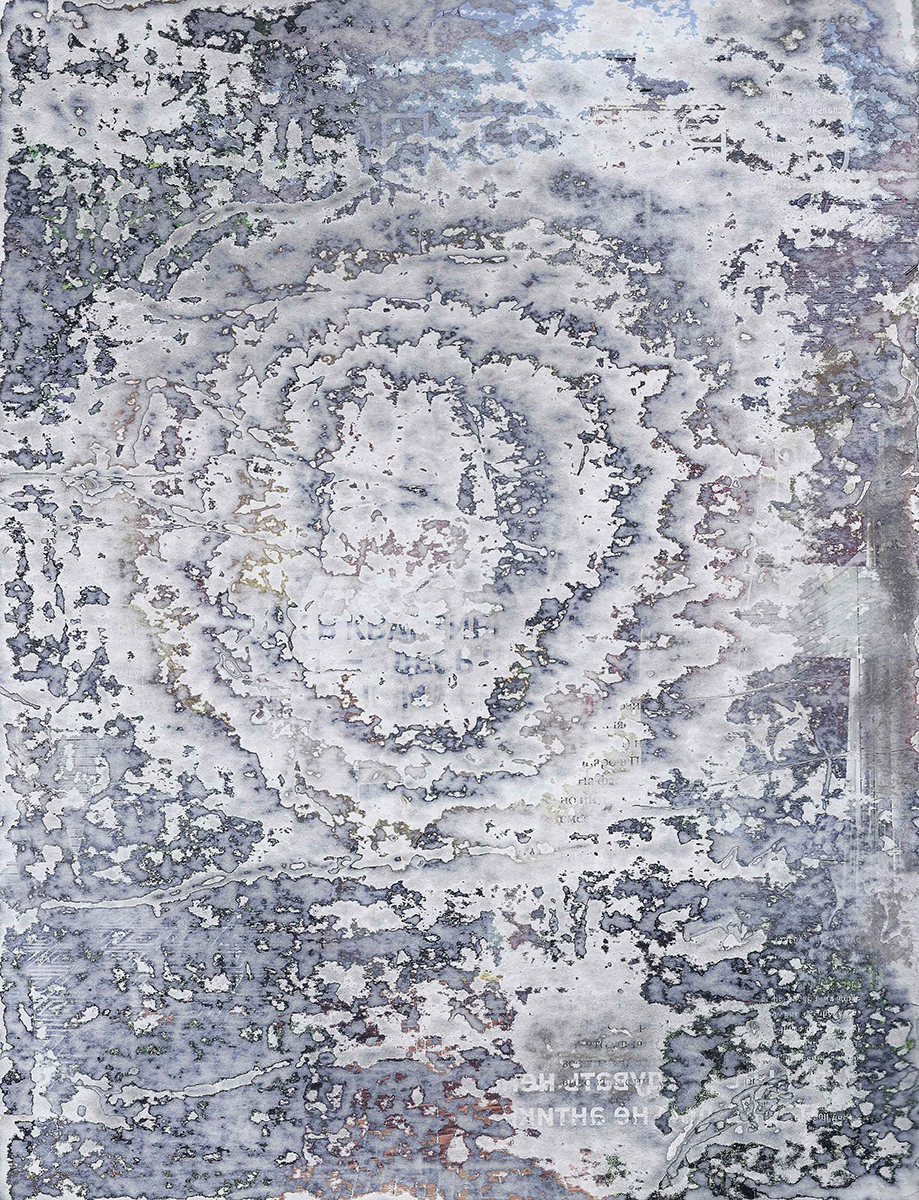 J’ai développé une technique de compression de papier, créant des supports aux usages multiples dont la surface une fois poncée revêt des motifs plus ou moins aléatoires. Le magazine papier est présenté comme un artefact de lui-même, un solide non consultable qui communique avec le regardeur de façon transversale, à travers les couches superposées formant sa surface.