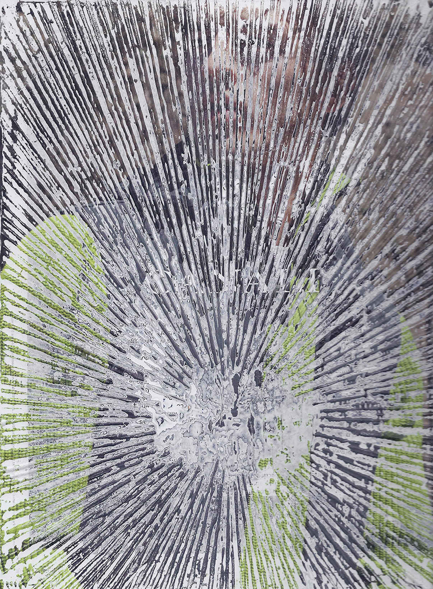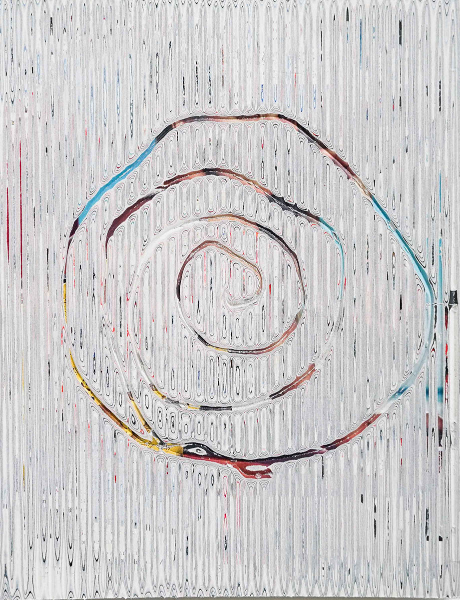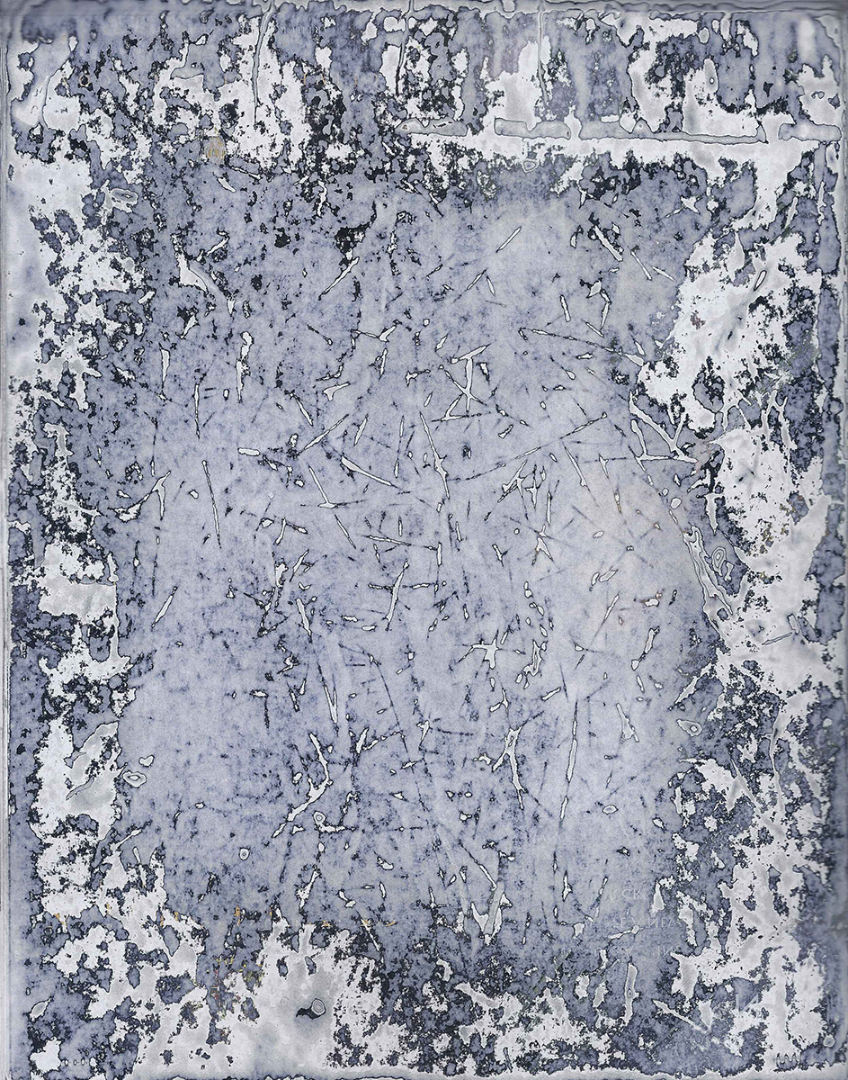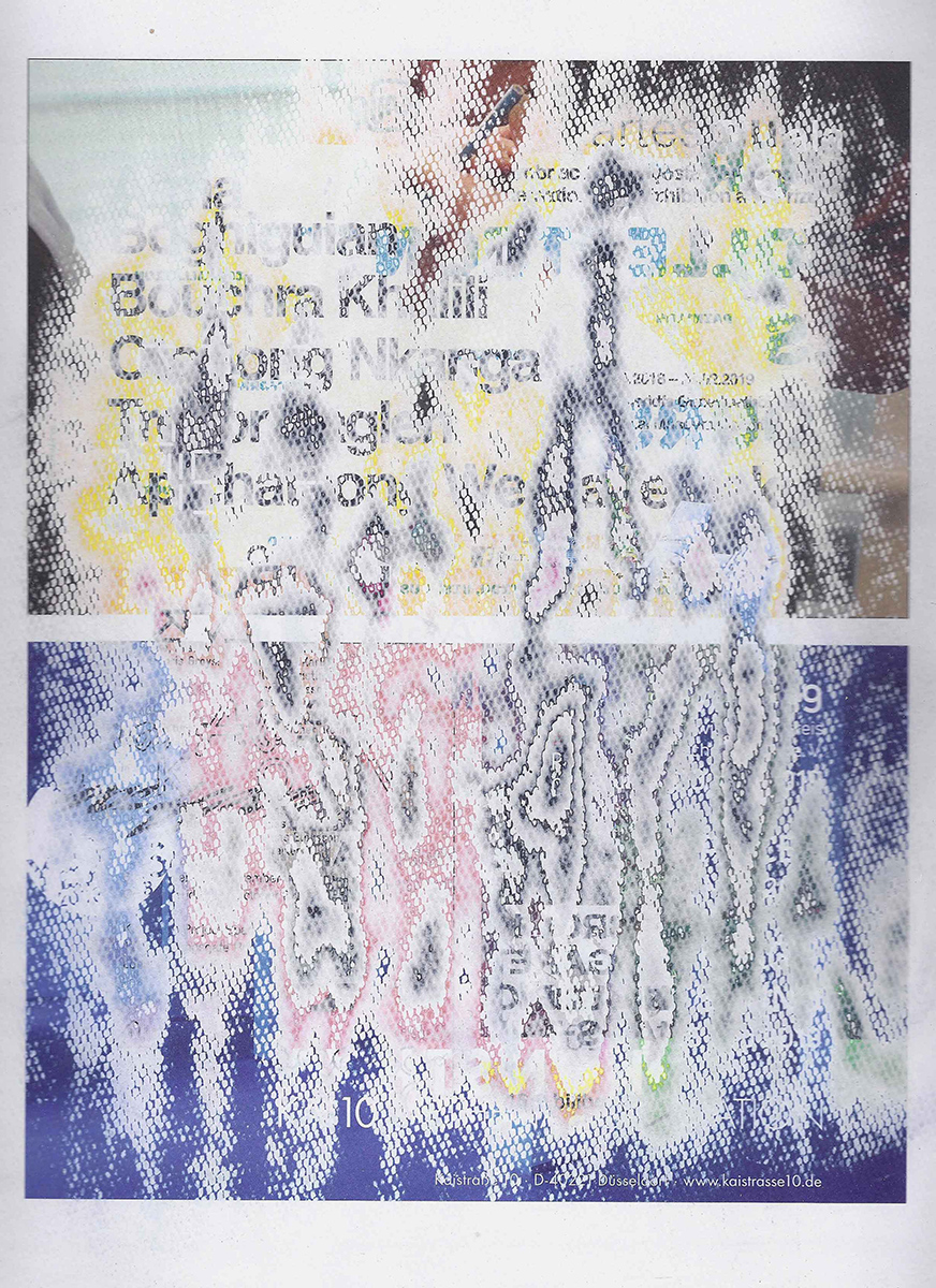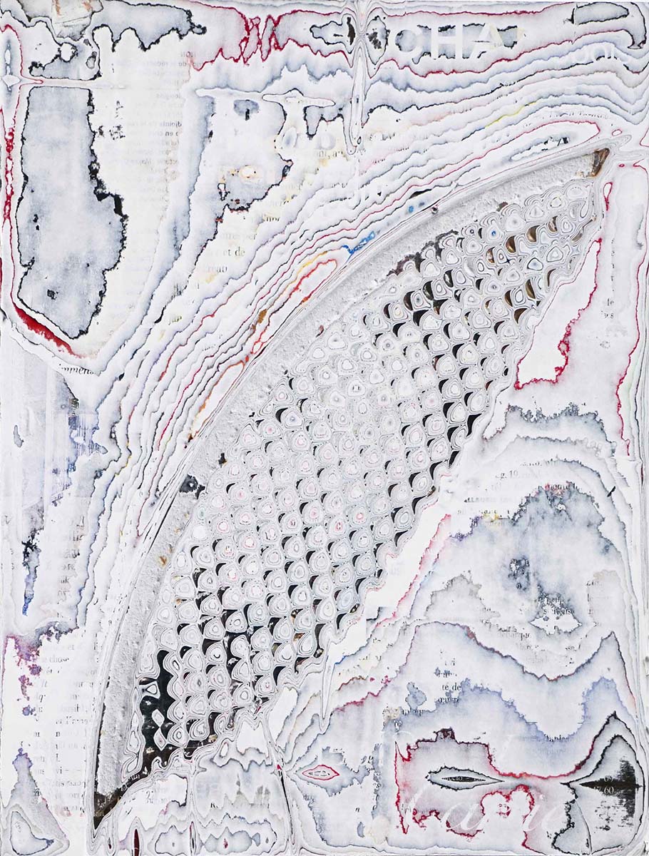 J’ai développé une technique de compression de papier, créant des supports aux usages multiples dont la surface une fois poncée revêt des motifs plus ou moins aléatoires. Le magazine papier est présenté comme un artefact de lui-même, un solide non consultable qui communique avec le regardeur de façon transversale, à travers les couches superposées formant sa surface.