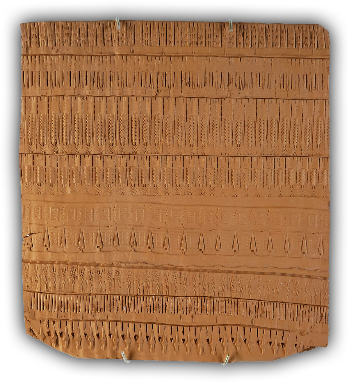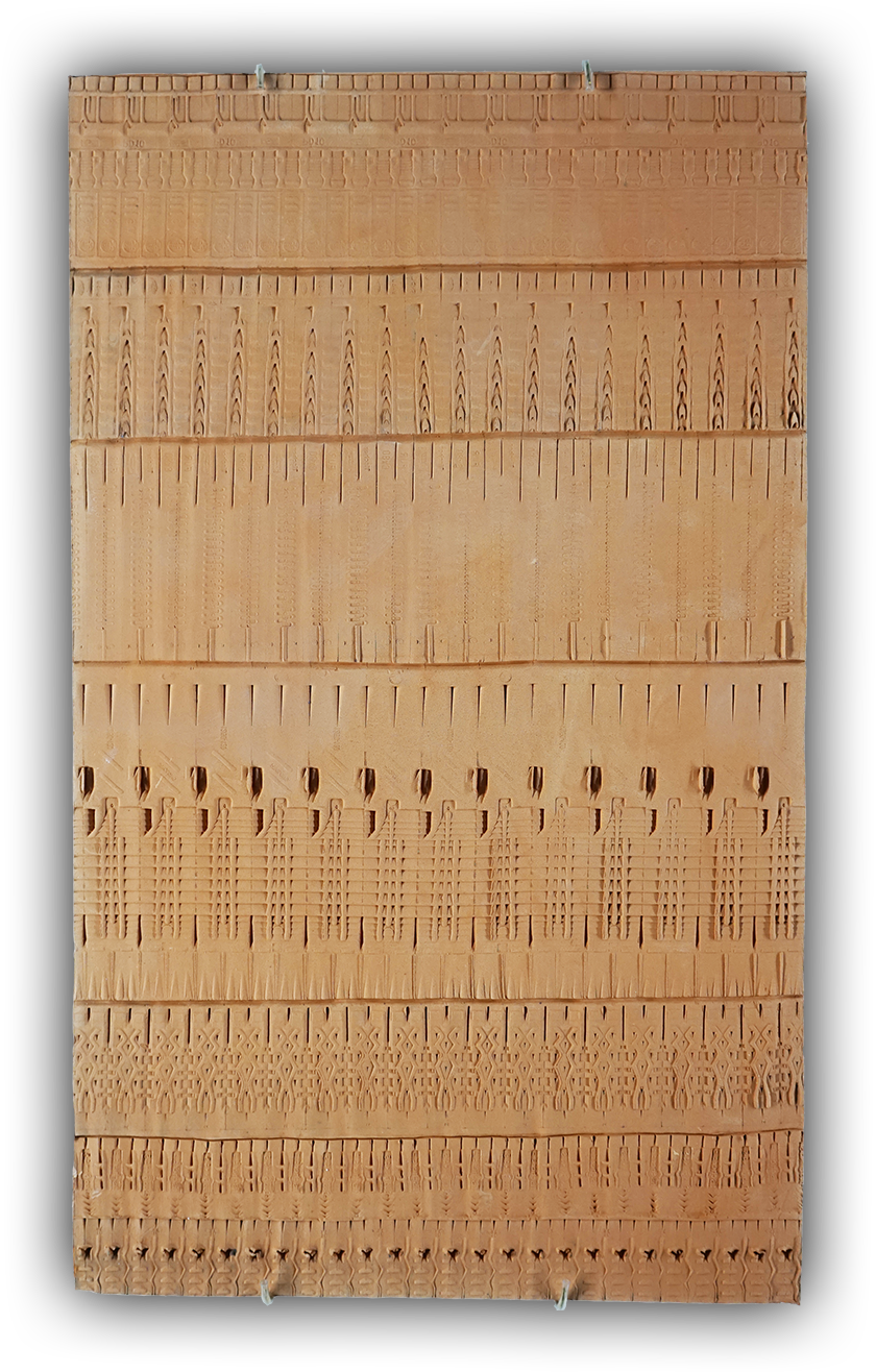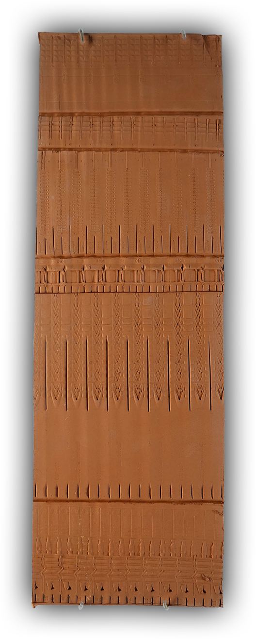 Ces œuvres se présentent comme des objets plats en terre cuite dont la surface est recouverte d’inscriptions abstraites. Pour les réaliser, j’ai fait rouler des chevilles de bricolage en frise, pour en relever les reliefs, comme les sceaux-cylindres archaïques. Je collectionne ces objets industriels sophistiqués, dont on ne prête pas attention à la forme, dans un mouvement d’appropriation d’un outil quotidien du chantier d’exposition qui devient outil de dessin, medium d’expression.