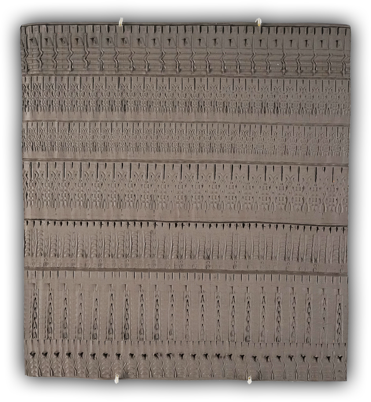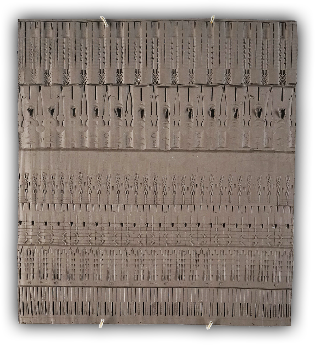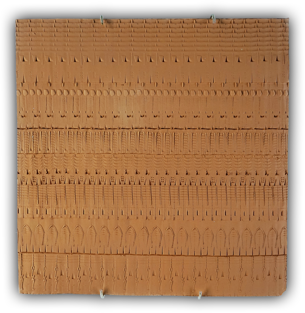Ces œuvres se présentent comme des objets plats en terre cuite dont la surface est recouverte d’inscriptions abstraites. Pour les réaliser, j’ai fait rouler des chevilles de bricolage en frise, pour en relever les reliefs, comme les sceaux-cylindres archaïques. Je collectionne ces objets industriels sophistiqués, dont on ne prête pas attention à la forme, dans un mouvement d’appropriation d’un outil quotidien du chantier d’exposition qui devient outil de dessin, medium d’expression.